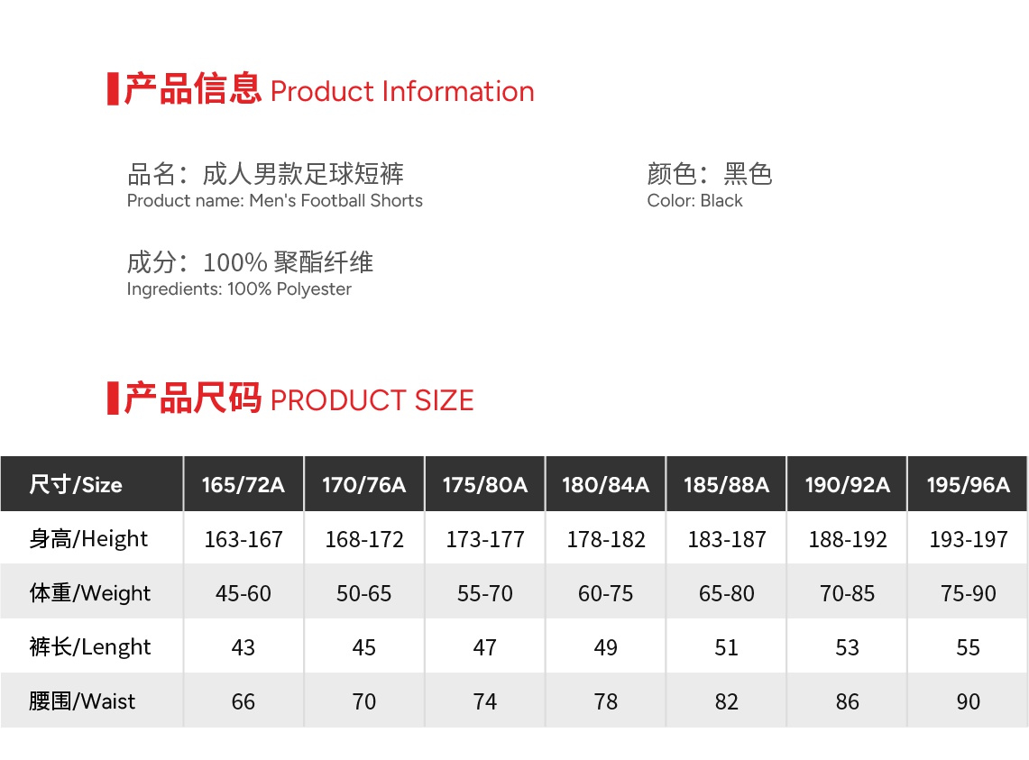 Size 165 or 170 or 175 or 180 or 185 or 190 or 195