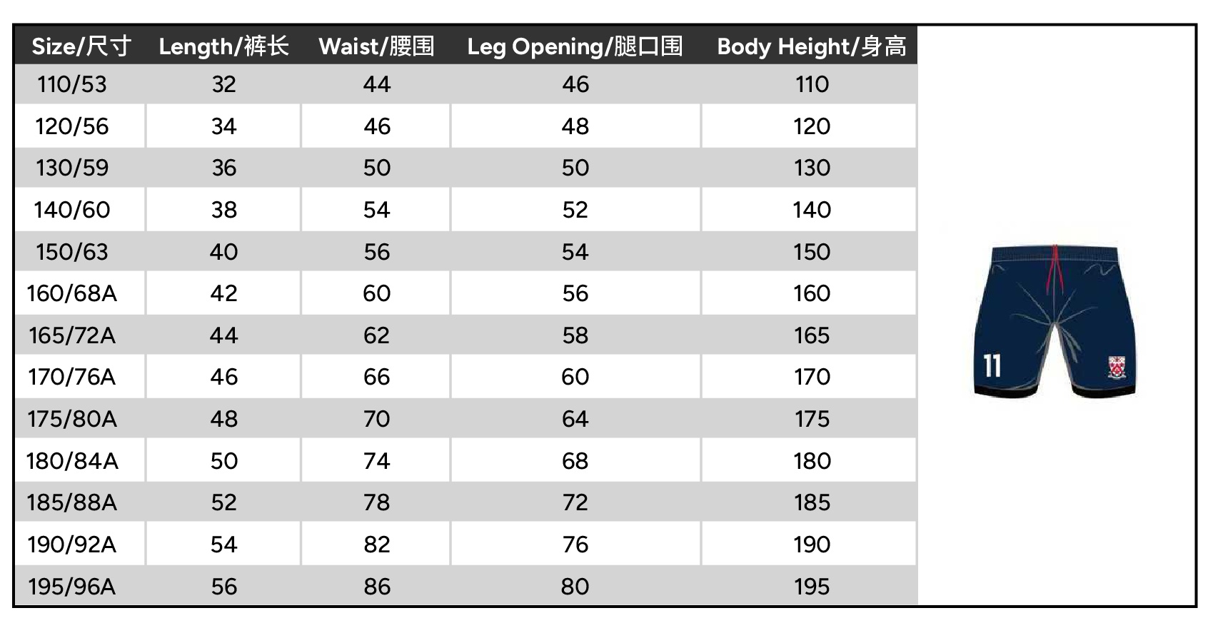Size 110 or 120 or 130 or 140 or 150 or 160 or 165 or 170 or 175 or 180 or 185 or 190 or 195